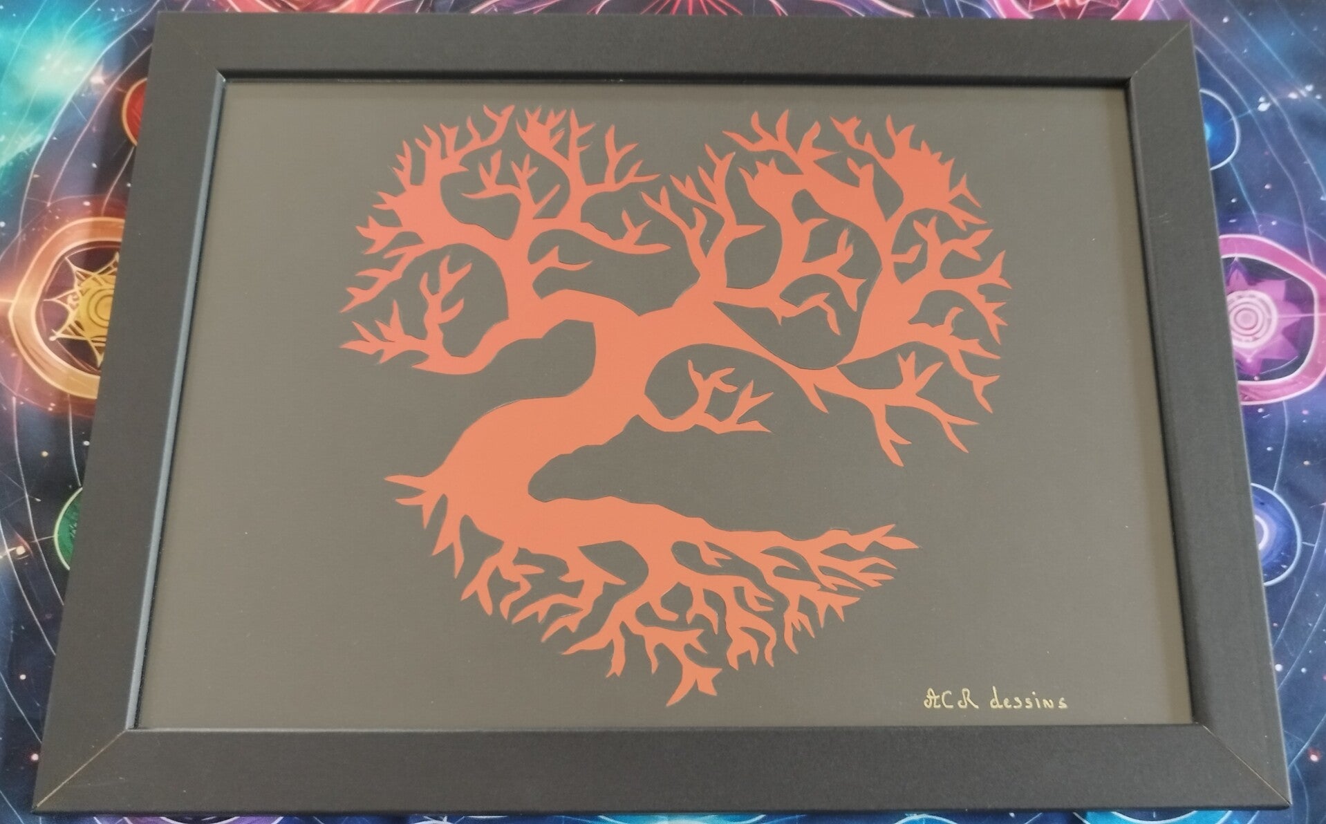 Dessin réalisé par découpage d'une feuille Canson noire en superposition d'un fond rouge métalisé.